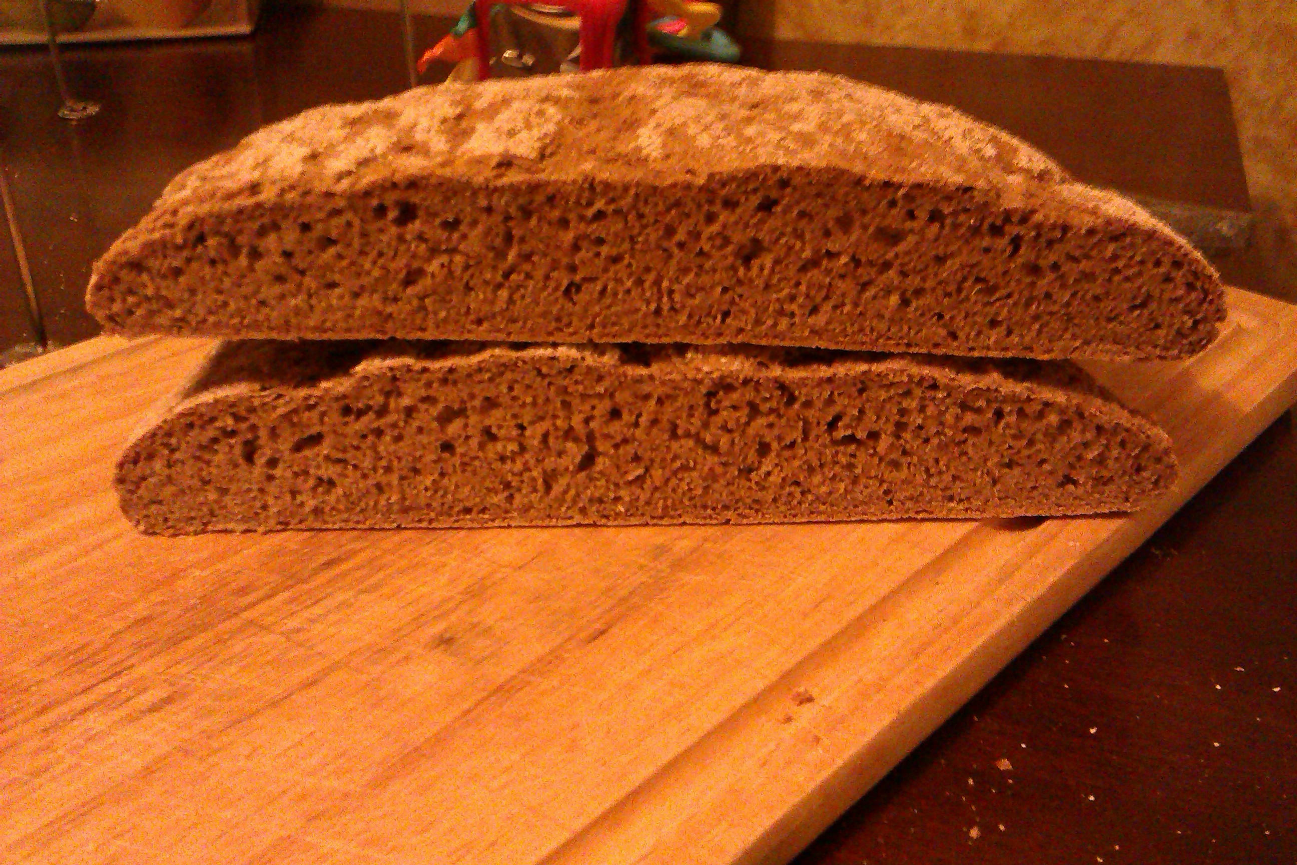 Al cortarlo, encontré que el pan estaba bien cocido y esponjoso por dentro. Al cortarlo todavía tibio, la goma del centeno se pegó un poco al cuchillo, pero ese efecto desapareció al enfriarse completamente.